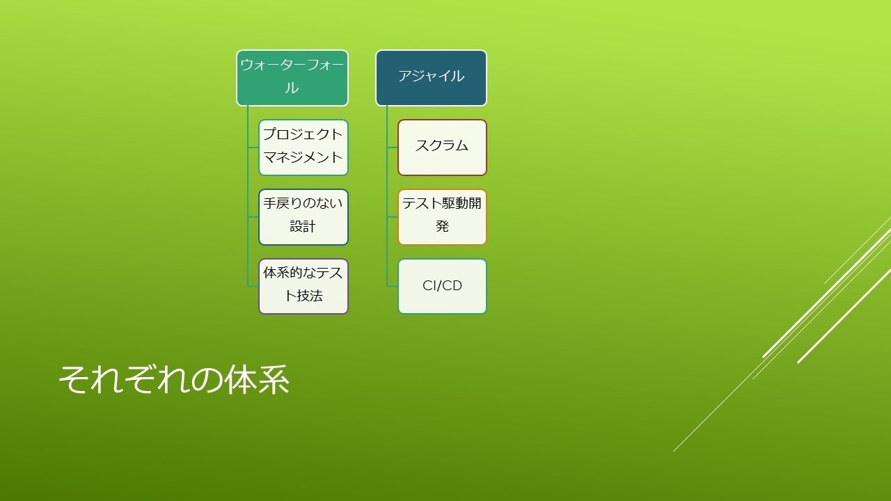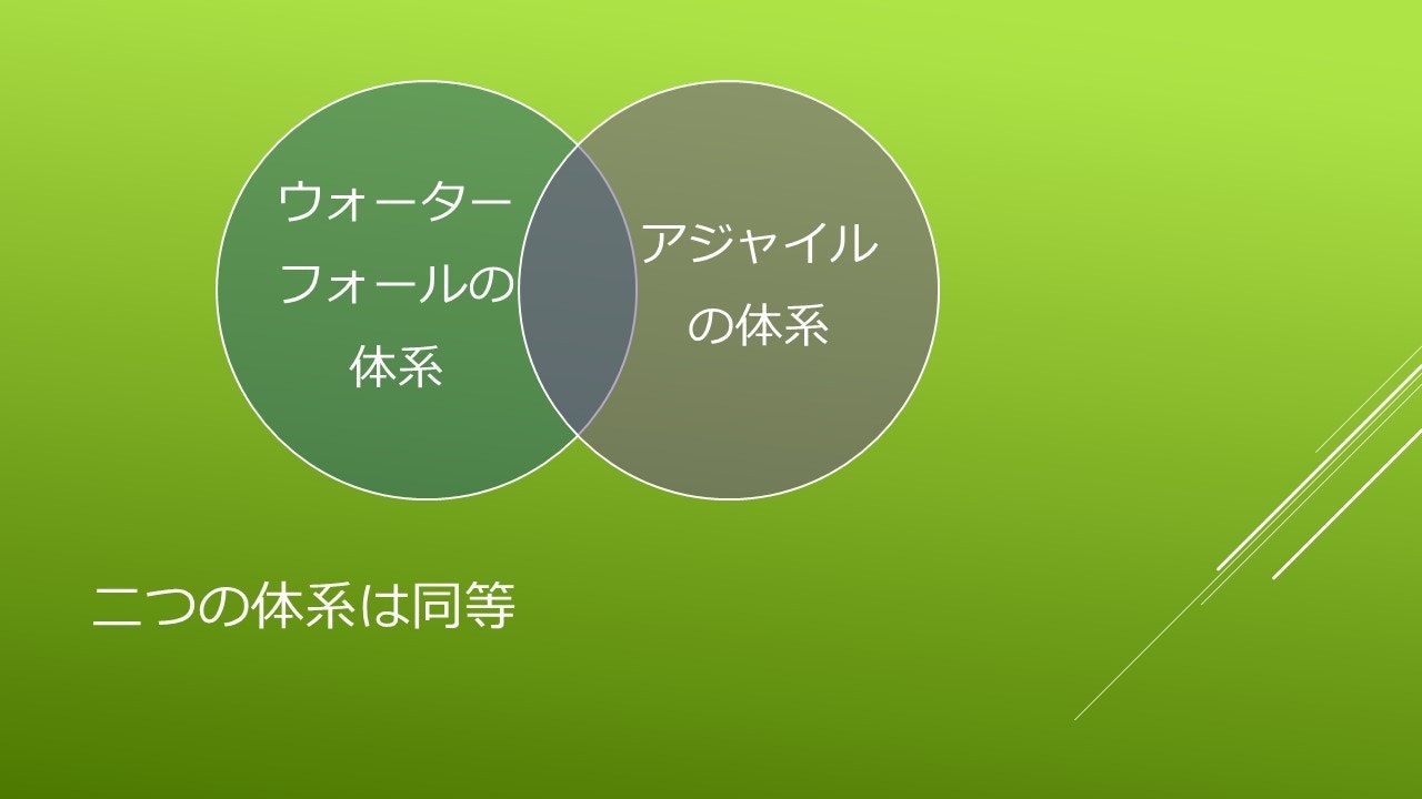 さて、一般的にはアジャイル開発はウォーターフォールの反対側に位置するものと考えられがちです。
