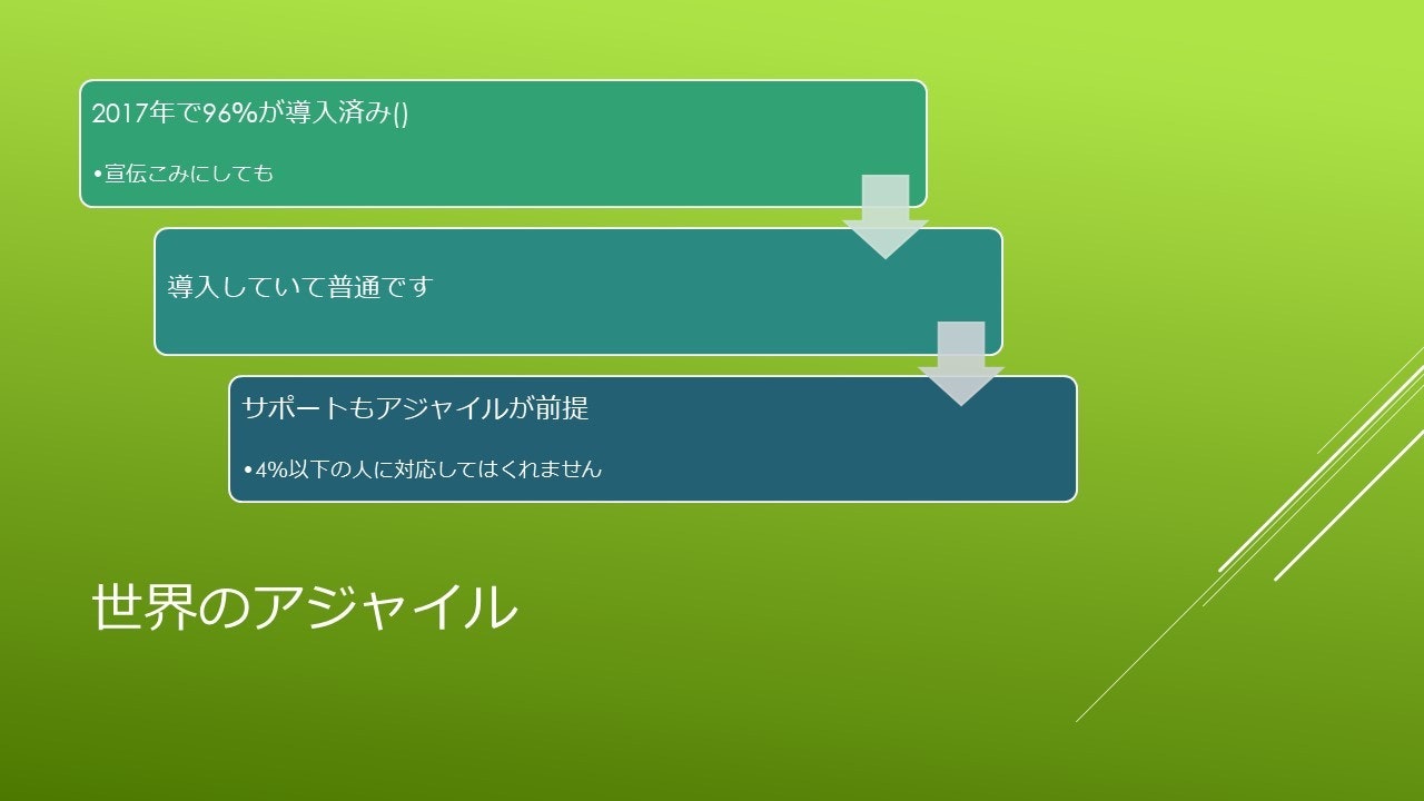 実際、世界中でアジャイルが広がっていて、特に欧米では顕著です。2017年の調査では、96%の企業がアジャイルを導入しているという結果が出ています。