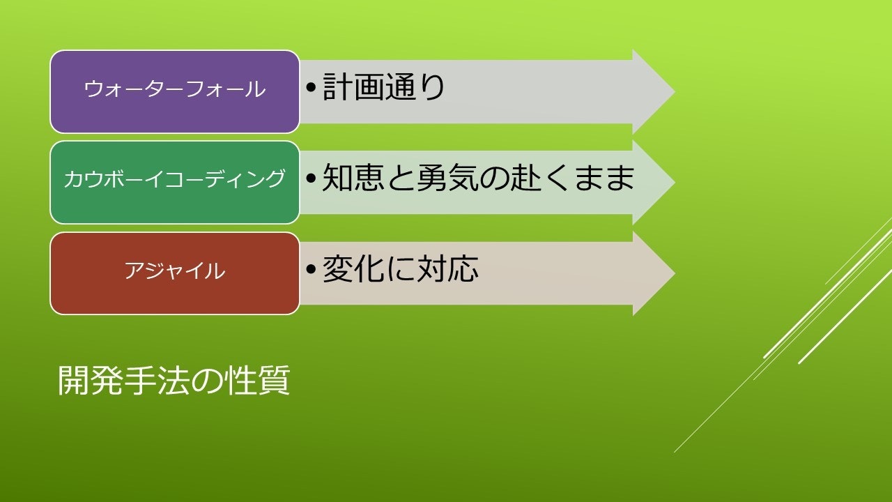 実際には、アジャイルとウォーターフォールは多くの点で共通しています。両者は理論的にしっかりと体系立てられた開発手法であり、対してカウボーイコーディングにはそれがない。つまり、仲間外れはカウボーイコーディングなのです。