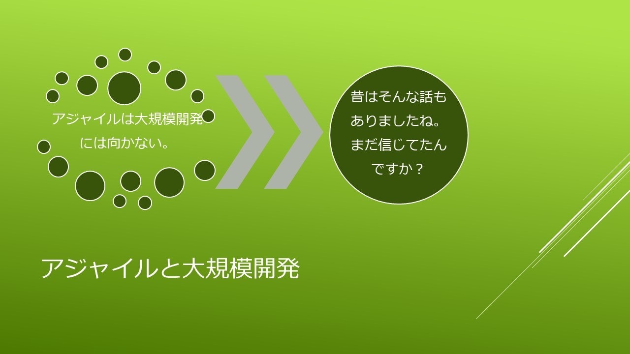 さて、「アジャイルは大規模開発には向かない」といまだに言われることがありますが、それはもう昔の話です。20年前に言われていた話ですね。それから時間がたち、今ではアジャイルにも大規模開発に対応するノウハウがたくさん蓄積されています。