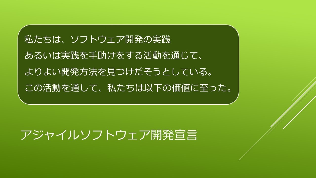 アジャイルの話をする上で、まず出てくるのが「アジャイルソフトウェア開発宣言」ですね。