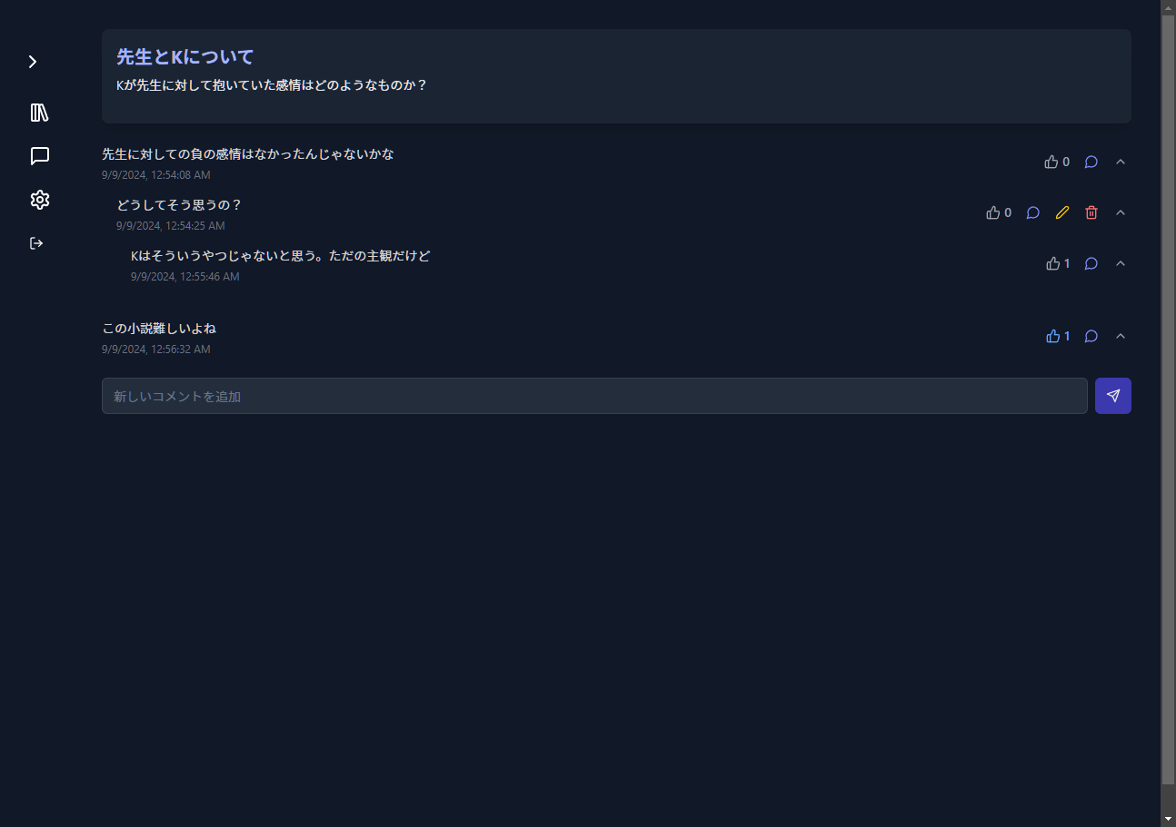 - 他のユーザーとチャットでき、書籍に対してディスカッションできる