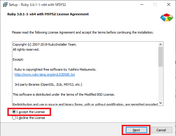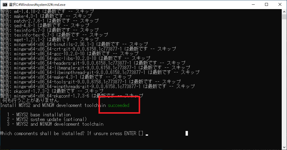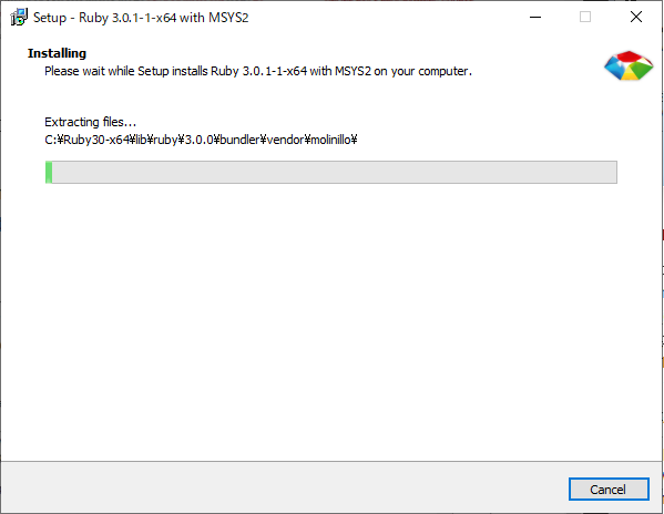 「2.Ruby本体のインストール」を手順通りに終わらせると、MSYS2というやつのインストールが始まりました。