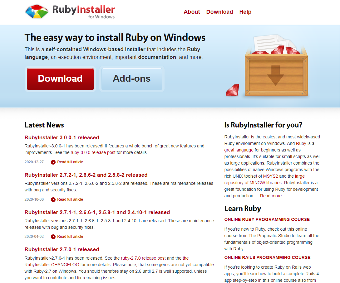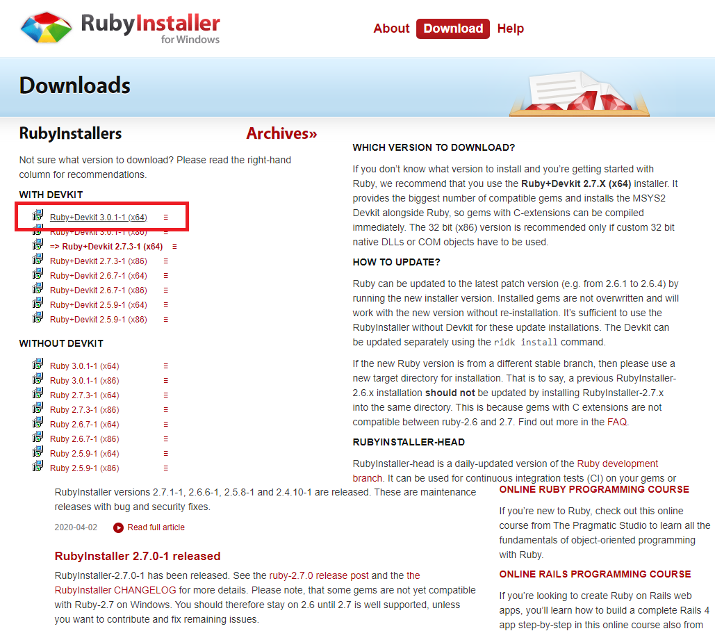 今回はWindows10向けに提供されている「RubyInstaller」( https://rubyinstaller.org/ )を利用する事にしました。