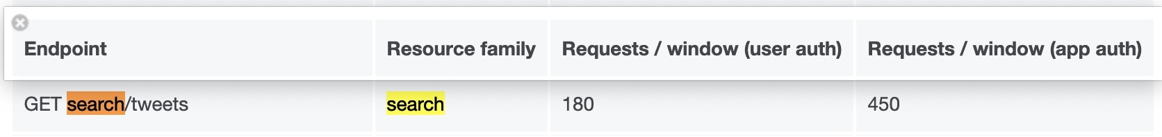 - Twitter APIの検索リクエストの上限は下記の通りです(15分毎の値)