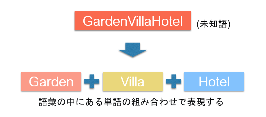上の画像のようになる.この場合は「GardenVillHotel」という単語が語彙のリストの中になかったため,「Garden」,「Villa」,「Hotel」という,語彙の中にある単語の組み合わせで表現している.