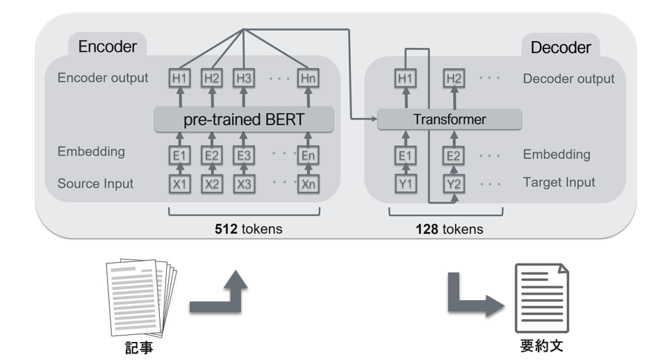 エンコーダにはBERT,デコーダにはTransformerを使っている.BERTの事前学習モデルは京都大学 黒橋・河原研究室にて公開されているものを使用している.BERTは高性能なエンコーダになれるが,デコーダにはなれない.理由は,エンコーダの入力を受け取れないから.しかし,BERTは構造的にはTransformerの集合なので,ほぼ同じと考えてもいい.