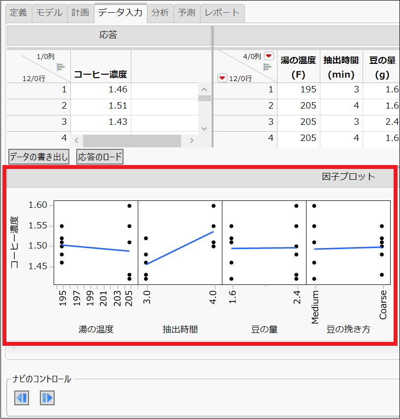 各実験をその計画に沿って実施し、得られた結果(コーヒー濃度)を「データ入力」タブで順に入力していきます。