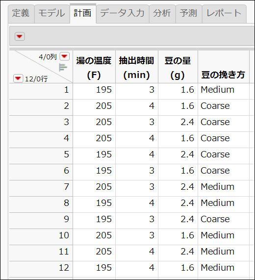 「計画」タブに進むと、JMPによって自動的に12回分の実験計画が生成されます。