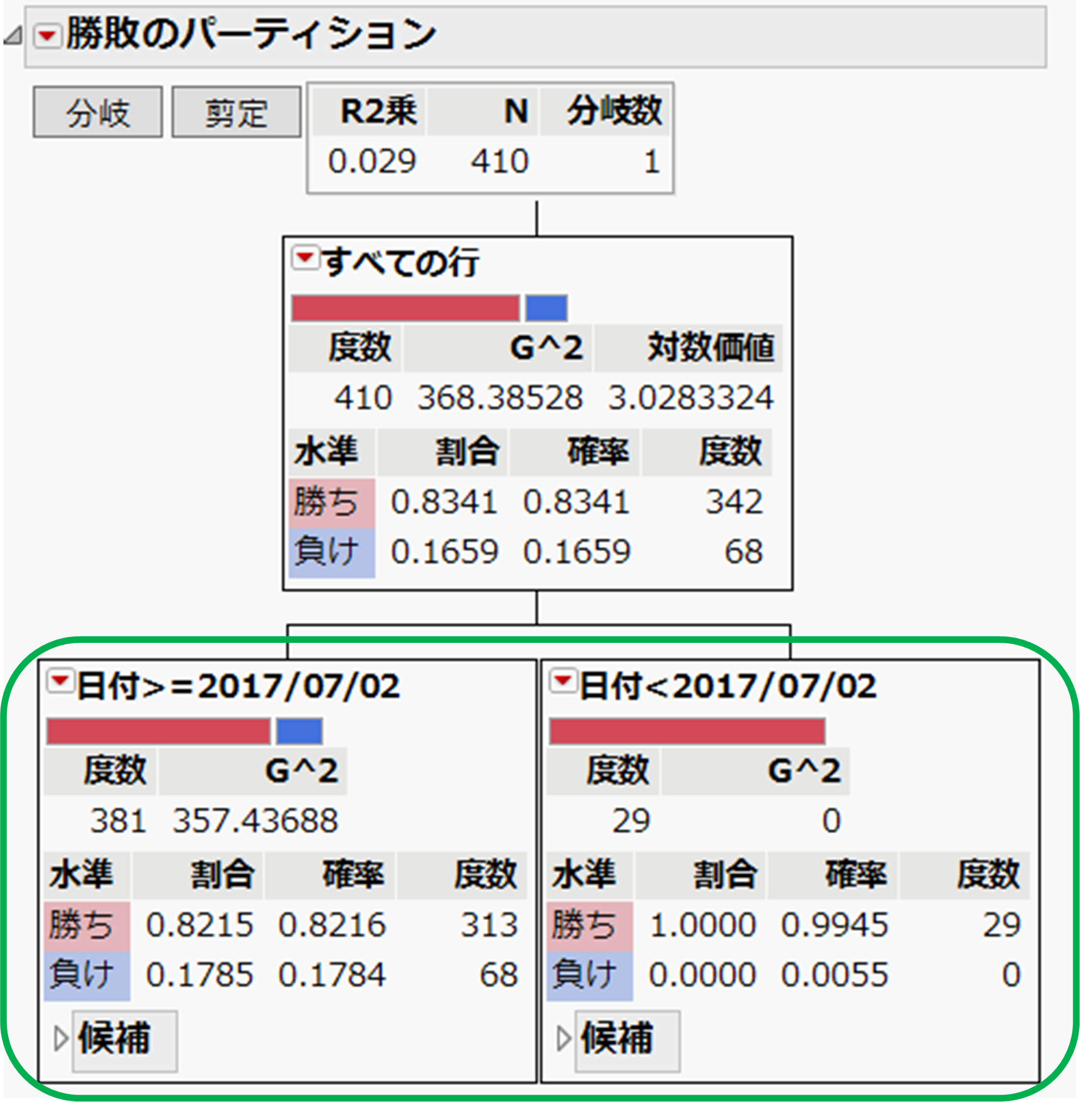 ここでは勝敗(勝ち/負け)を目的変数、先手・後手、対戦日を説明変数としたパーティションを実行し、勝敗を最も区別するように、データを2つのグループに分割していきます。