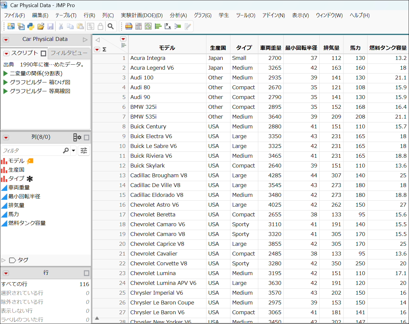では、さっそく操作を始めましょう。JMPで用意されているサンプルデータの中から、今回は「Car Physical Data」を使って正規性を確認してみます。