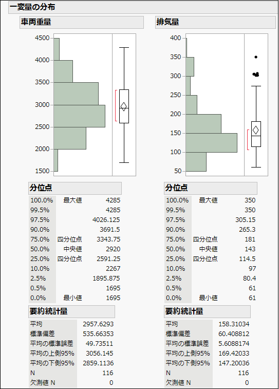 「分析」から「一変量の分布」と進み、「車両重量」「排気量」を「Y, 列」に入れて「OK」を押すと、ヒストグラムや箱ひげ図とともに下のレポートが表示されます。