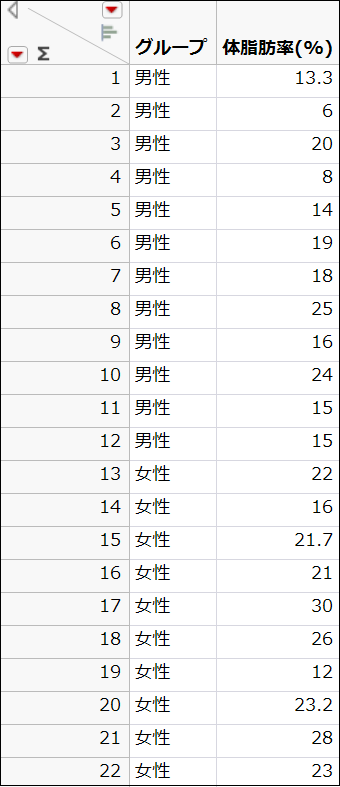 以下の標本データは、1年間、週に5回ジムでトレーニングに励む男女グループの体脂肪率を測定したものです。このデータをもとに、ジムに通う男性と女性の母集団の体脂肪率の平均値に差があるのかを確認します。
