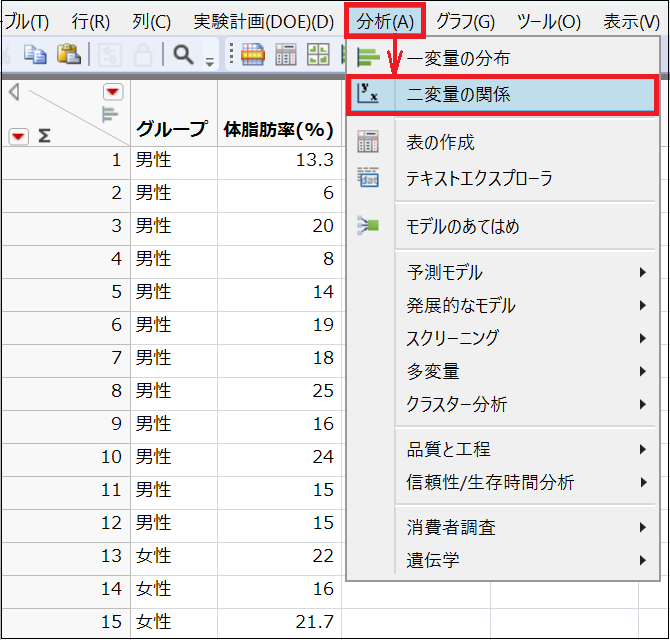 2.JMPでは一元配置分析のなかにt検定が含まれています。そこで、画面上の「分析」>「二変量の関係」と進み、「X, 説明変数」に「グループ」、「Y, 目的変数」に「体脂肪率(%)」を入れて「OK」を押します。