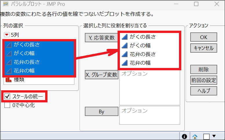 「グラフ」から「パラレルプロット」と進み、「がくの長さ」、「がくの幅」、「花弁の長さ」、「花弁の幅」を選択し、「Y, 応答変数」をクリック。「スケールの統一」にもチェックして「OK」を押します。