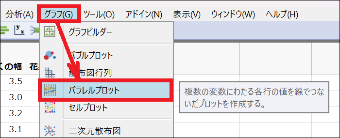 すると、並行座標プロット(パラレルプロット)が表示されます。