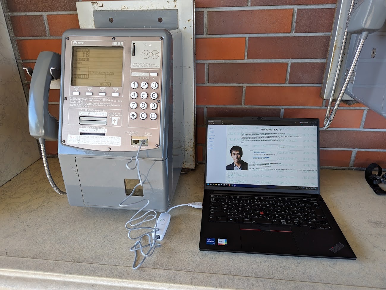 この写真は、東京ディズニーランドの前に設置されている公衆電話に、モジュラーケーブルとモデムと呼ばれるものを用いてノートパソコンを繋いで、インターネットに接続している様子である。これはインターネット黎明期に主流であった「ダイヤルアップ接続」と呼ばれる手法を用いて実現している。