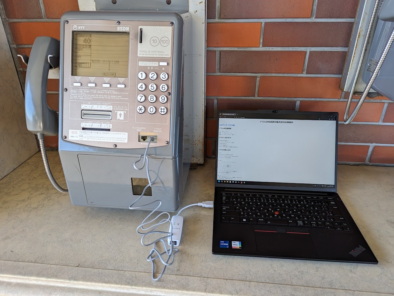 接続設定を完了させたら、端末のUSBポートにUSB型モデムを接続して、そこにモジュラーケーブルを接続する。そしてそのモジュラーケーブルをさらに公衆電話の端末接続口(今回はアナログ)に接続する。