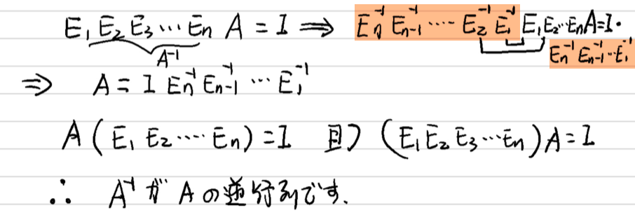 一連の基本行列$\boldsymbol{E_i}$を通して、行列$\boldsymbol{A}$を変換して、単位行列$\boldsymbol{I}$