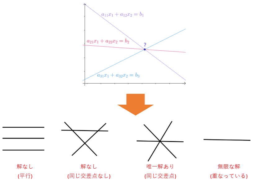 \boldsymbol{A}\boldsymbol{x}=\boldsymbol{b}\ \ \begin{cases}\text{解なし:}&\boldsymbol{b}\ \text{が}\ \boldsymbol{A}\boldsymbol{x}=\boldsymbol{y}\ \text{の値域内ではない}\\\text{解あり解:}&\boldsymbol{b}\ \text{が}\ \boldsymbol{A}\boldsymbol{x}=\boldsymbol{y}\ \text{の値域内}\end{cases}