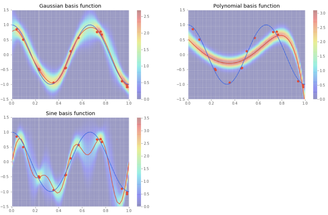 今回はガウス関数,sin関数,多項式を基底関数としてそれぞれグラフ化しました。実行結果を以下に示します。ガウス関数を基底関数に選んだ時が一番うまくフィッティング出来ています。またベイズ線形回帰では予測した結果の平均、分散がわかるので予測結果にどのくらい自信があるのかが分かります。線形回帰では得られないメリットです。