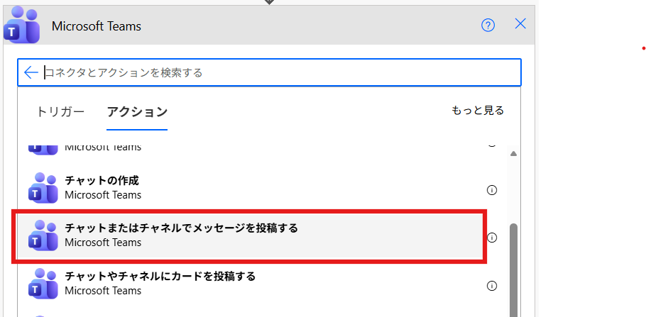 このように様々な種類のアクションがありますので、利用するものを検索して選択します。今回は赤枠の「チャットまたはチャネルでメッセージを投稿する」を選択します。