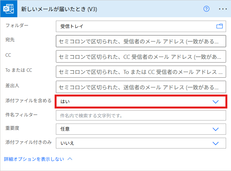 ・ファイル名:「新しいメールが届いたとき(V3)」の動的コンテンツ「添付ファイル名前」