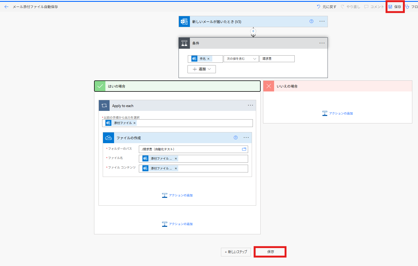 含んでいない場合の処理ですが、今回は何も処理を発生させないようにアクションは追加していません。添付ファイルを含んだメールが送られ、件名に「請求書」を含んでいないものであれば、正常に判定が完了し終了という形になります。
