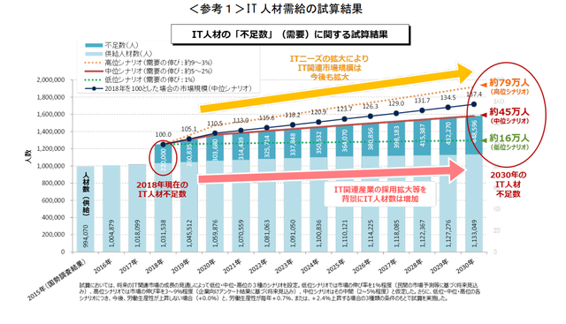 ・また「IT人材供給に関する調査」によると、需要は伸びていくにも関わらず、人材の不足が示唆されていることが分かる。さらに2030年までには30万人~79万人が不足になると予想されている。