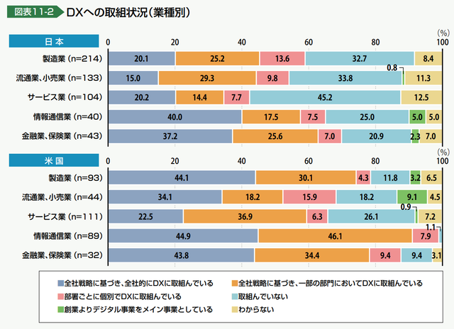 ・「DX白書2021」によると、日本ではサービス業を除く他の業界が半数以上、米国では全業界が半数以上、DXへの取り組みが行われている
