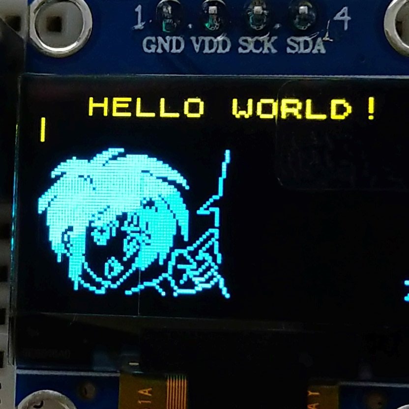 解像度128*64、8x8ドットで1文字、1行16文字、8行表示、トップ2行は黄色、3行目から8行目は水色で表示されます