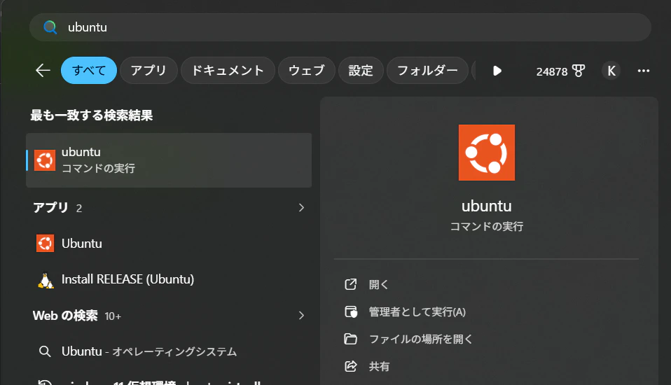 再起動後、windowsキーを押して、「ubuntu」と打ち込むと、オレンジ色のアイコンがでかでかと現れると思うので、そのままEnterを押してください。すると、起動します。