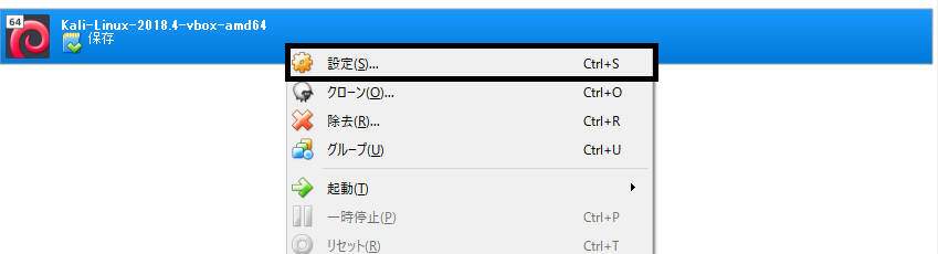 Virtualboxマネージャーにて「Kali-Linux-2018.4-vbox-amd64」を右クリックし、「設定」をクリックします。