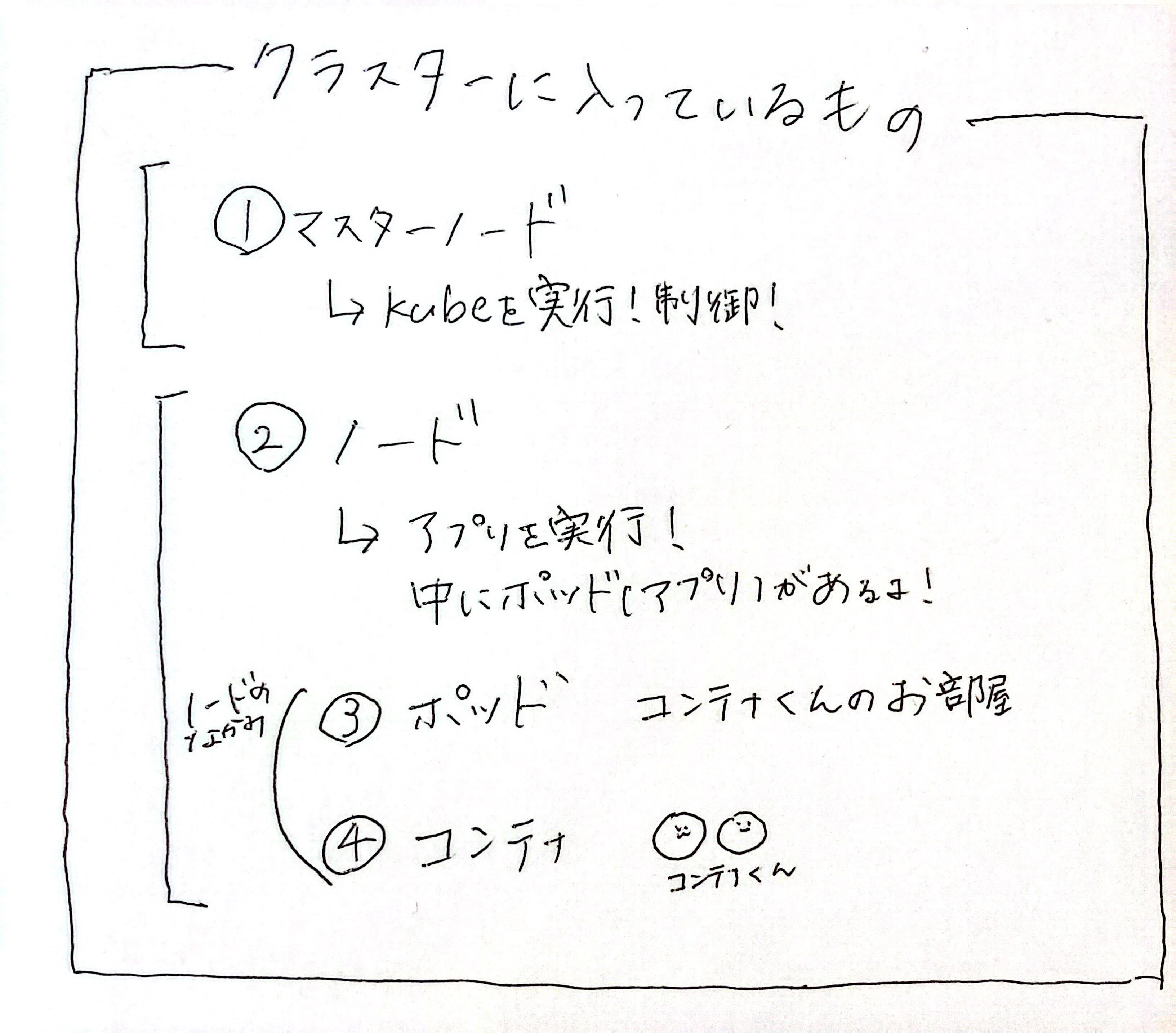 アプリケーションなどを実際に実行します。クラスターの中に複数のノードが存在します。 -