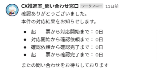 - 対応時間を短くすることが目的になり、対応がおざなりになってしまうのではないか?という意見があり、管理側が状況を確認するのみに利用をとどめ、返答としては戻さないことに。