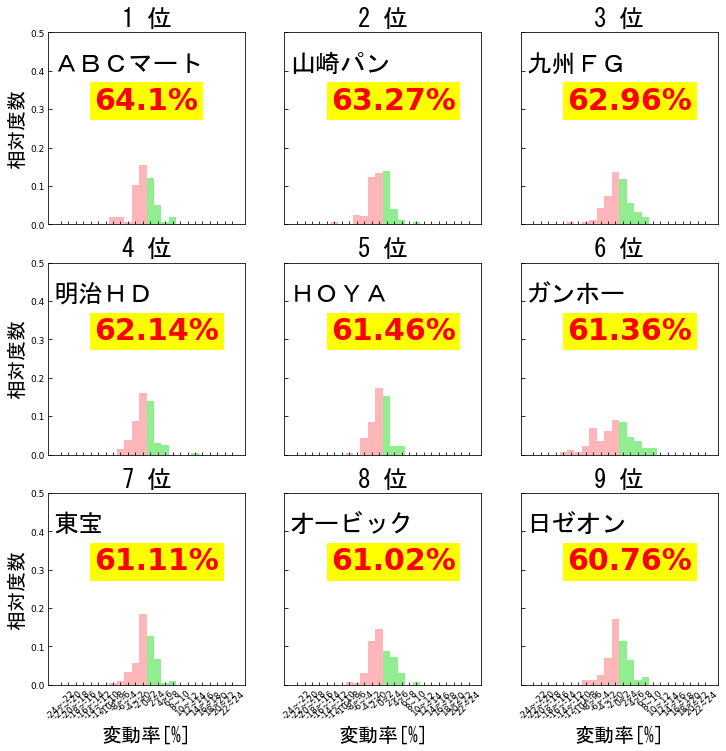 基本的に緑が上昇、赤が下落を意味し、分布図中の数字は上昇/下落している確率を意味します。