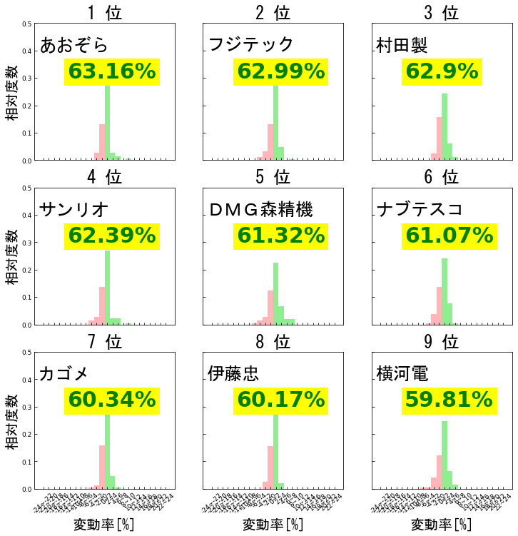# アッパーバンドを上回ったタイミングから数日後の株価上昇確率(各銘柄)
