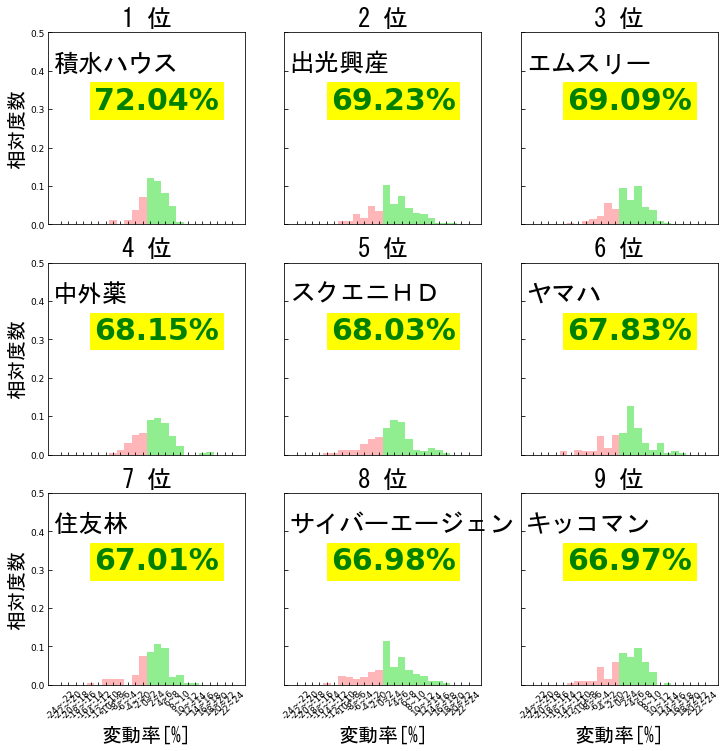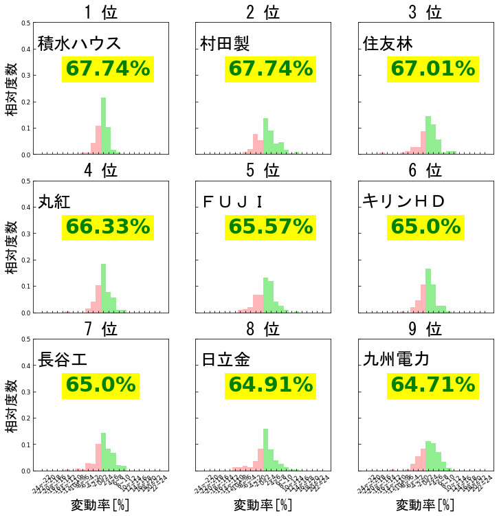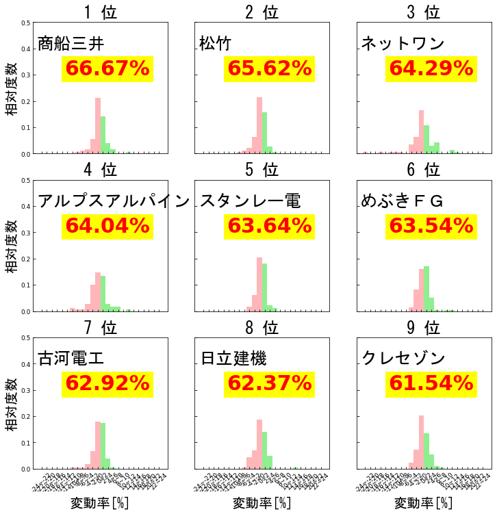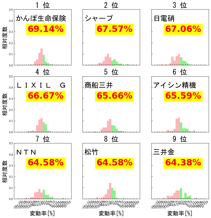 ここでは数日後に上昇/下落している確率と分布図を示します。