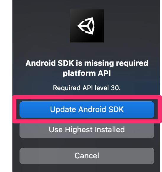 ターゲットAPIレベルを30にしてビルドボタンを押すとこのようなウインドウが出てきます。