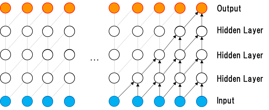 図を見てわかる通り, Reccurent Neural Networkに見られるような回帰的な接続が無いので, RNNより学習が速い.