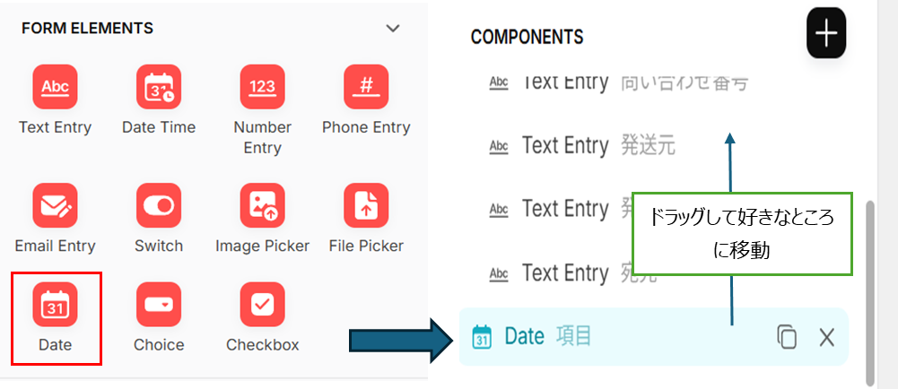 [左] COMPONENTS「+」➡ FORM ELEMENTS > Dateを選択