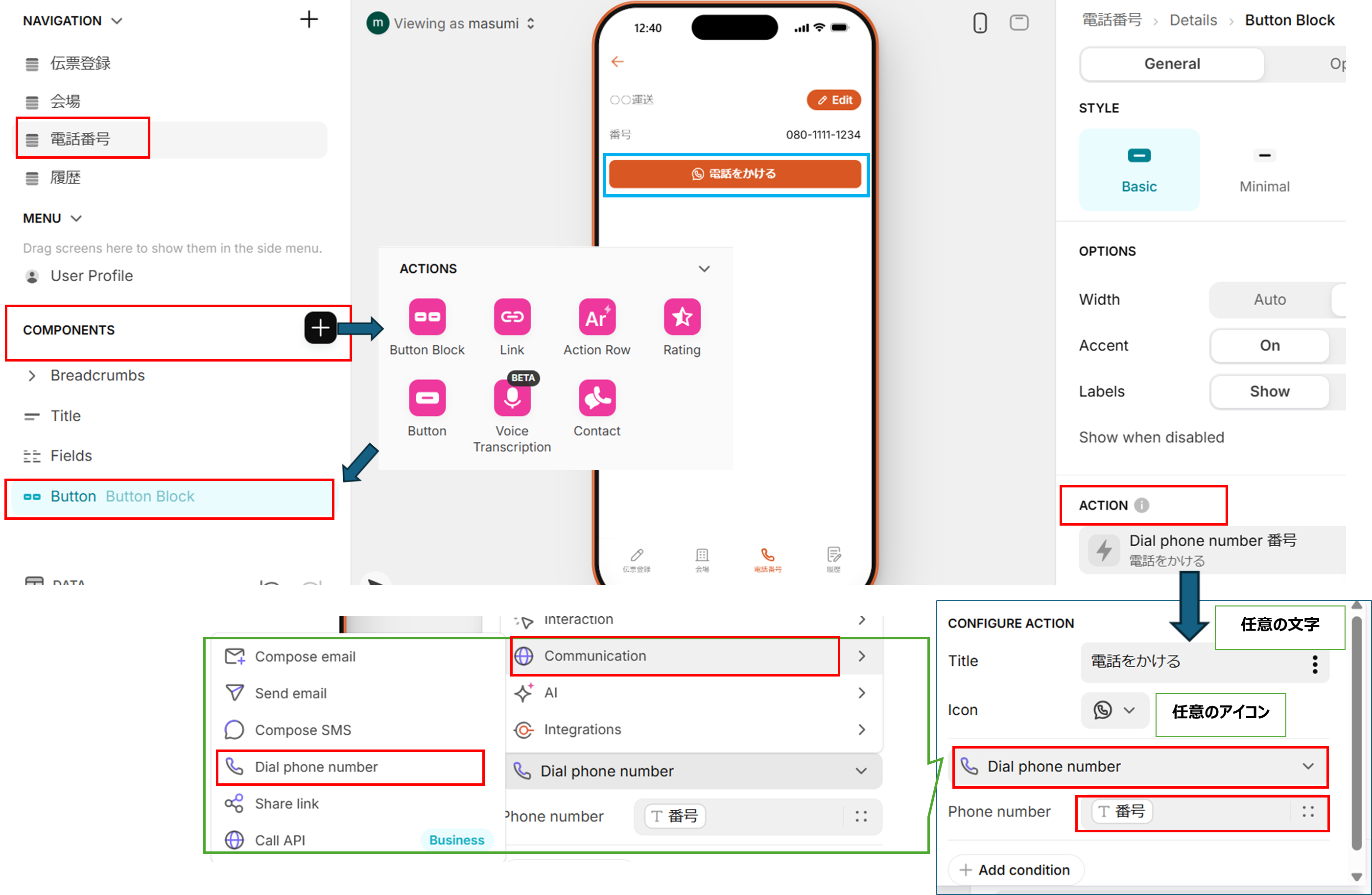 [左] NAVIGATION >「電話番号」を選択➡COMPONENTS > ACTION > Buttonを選択