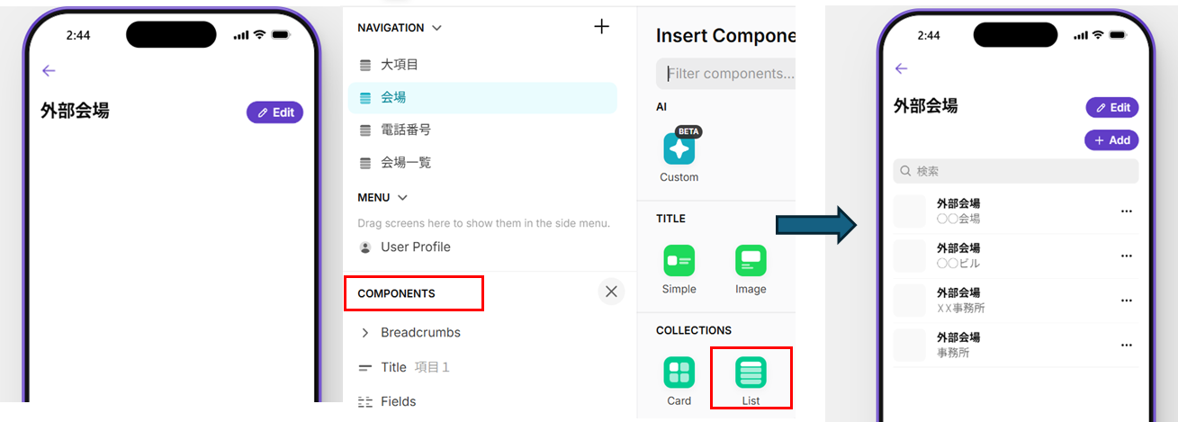 [左] COMPONENTS「+」を押す ➡ COLLECTIONS > Listを選択