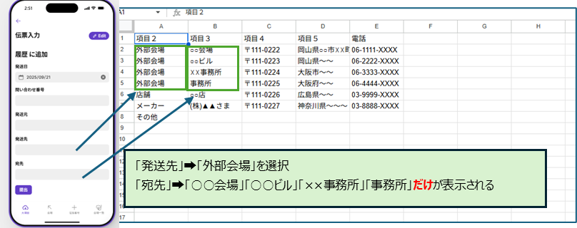 「宛先」は「発送先」の選択肢によって表示させるリスト情報を変えたい!