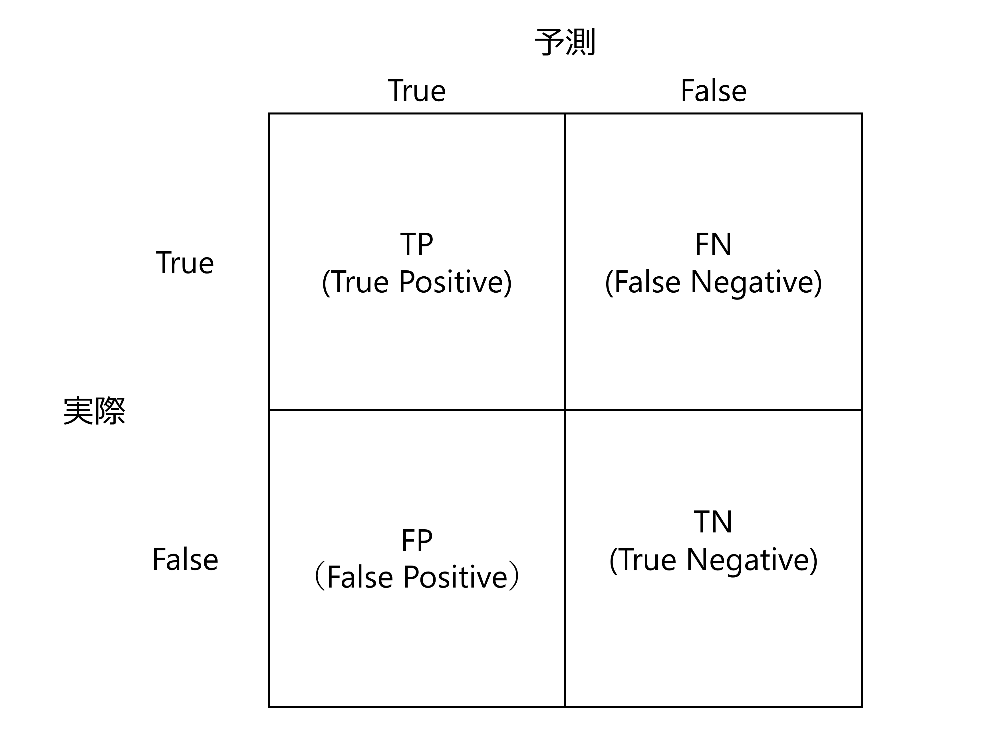 ここで、各指標を算出する際に使用する項目は。混合行列から理解することができます。以下の図に、混合行列を示します。また、以下の表に、各項目の概要を示します。