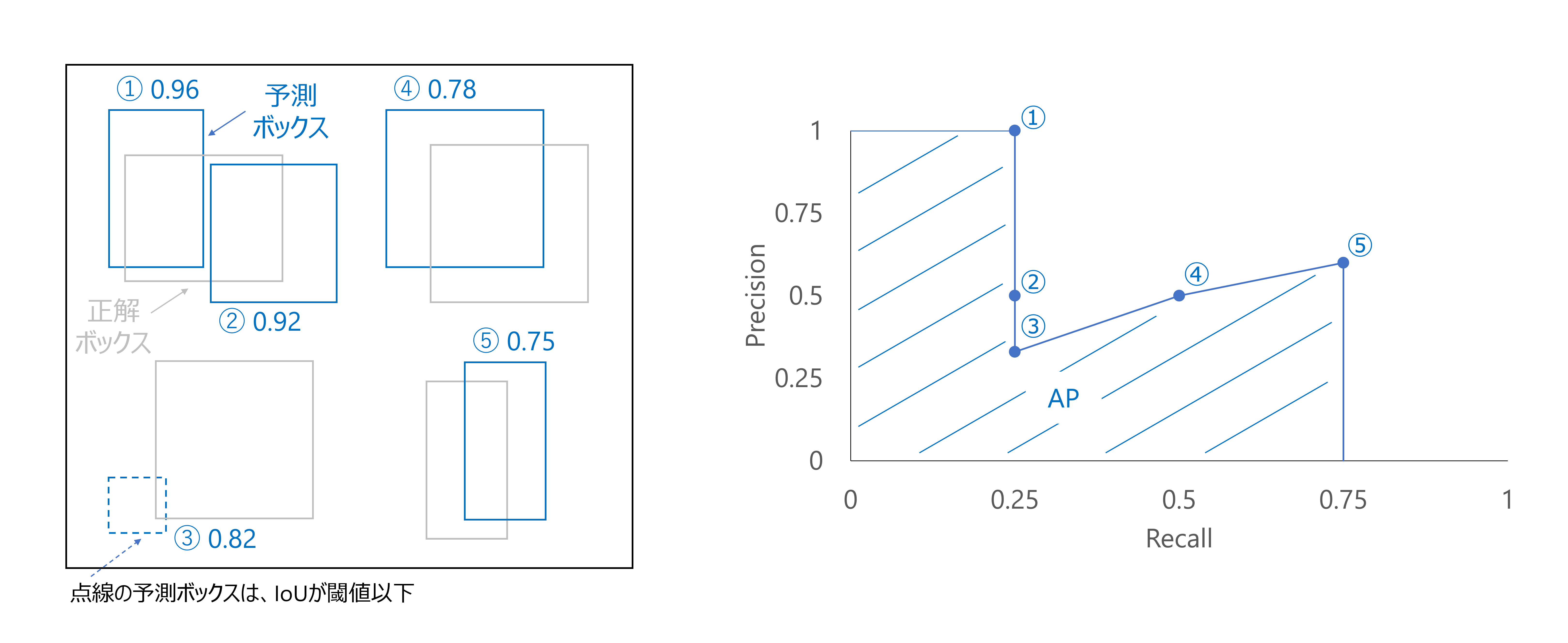 左図の①~⑤は予測ボックスであり、各番号横に記載される値はスコアを示します。 - RecallとPrecisionを計算し、PR曲線を描画