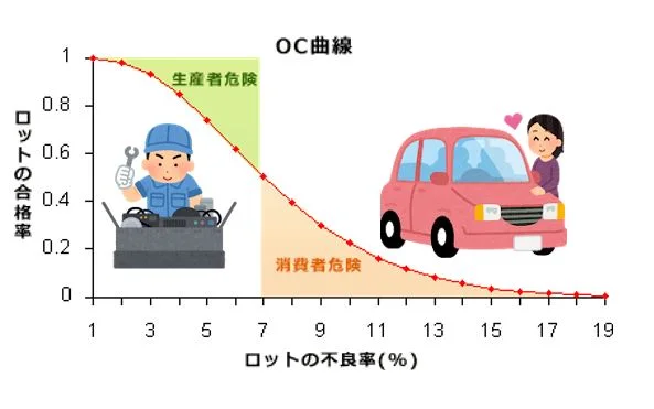 不良品の確率が低いのにロットの合格率も低いと、生産者が損をする。逆に、不良品の確率が高いのにロットの合格率も高いと、消費者が損をすることになる。なので、OC曲線は生産者と消費者がどのくらい損をするか、偏りすぎないように、でいい具合の所を見つけるために使用される。