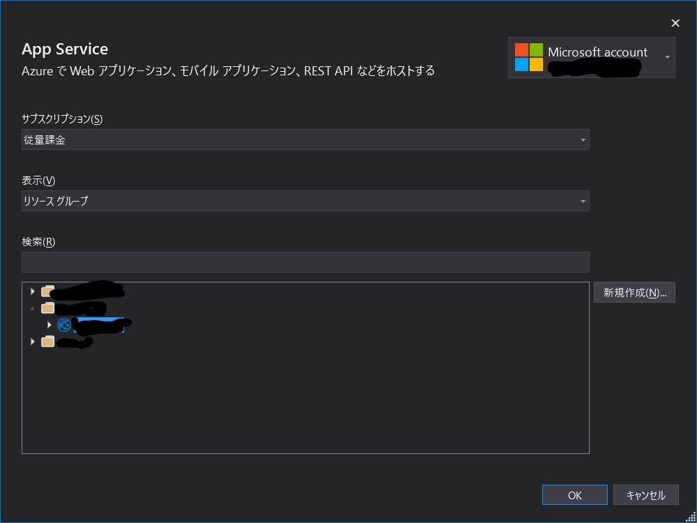 その下の画面に作成したAppServiceの名前が出てくると思うので、選択しOKを押してください。
