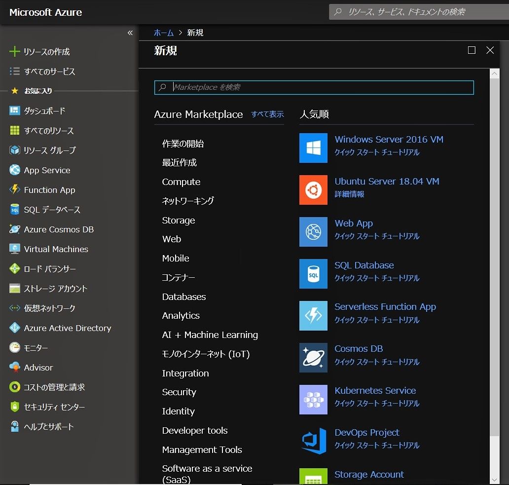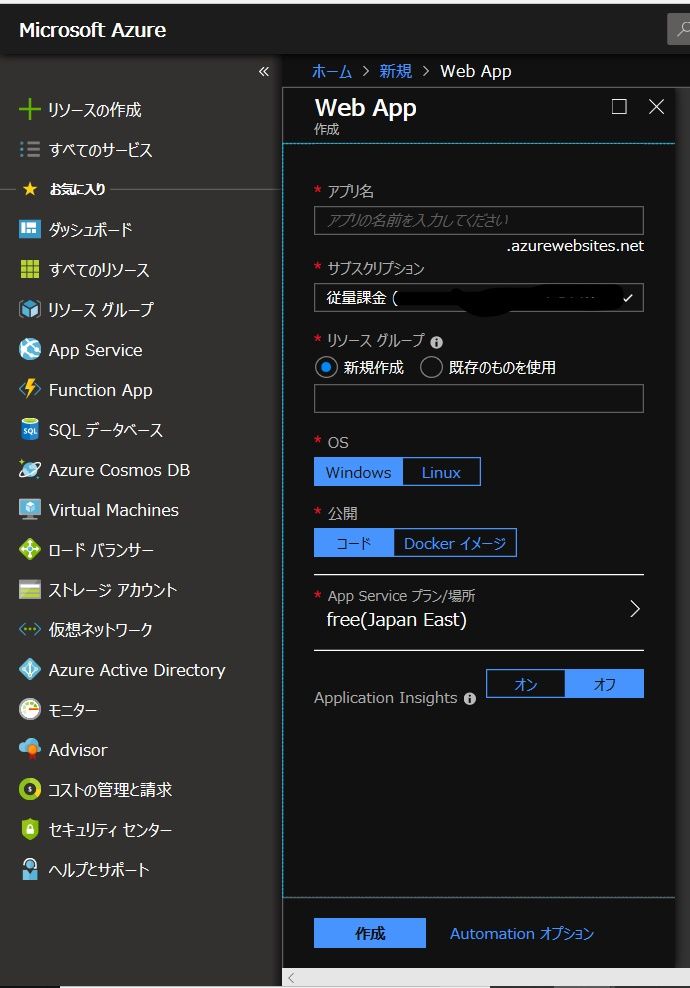 1.まずポータル(トップページみたいなもの)にログインし、リソースの作成を選ぶとこんな画面が出てきます。この中からWebAppを選択してください。