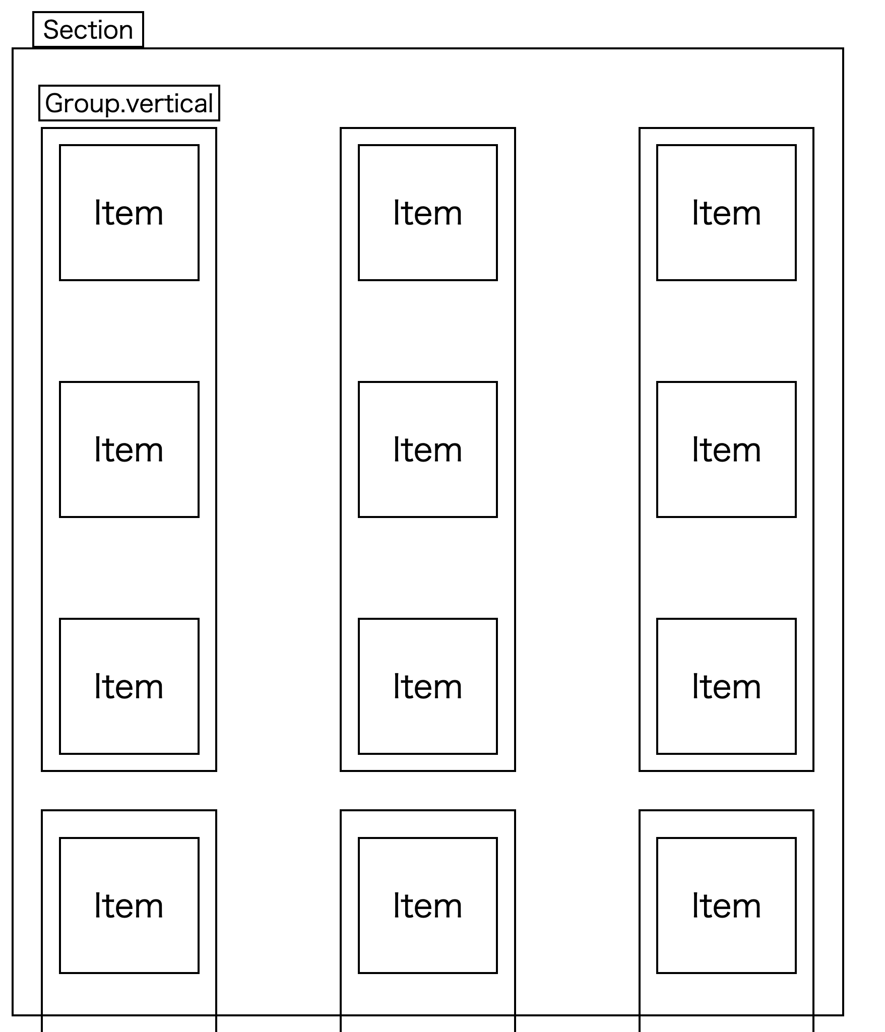 Itemは最初のGroupから順に入っていくのでIndexPathが見た目と大きくズレてしまうことや縦のGroupに入るItemの個数をViewModelなどに保持したデータから計算しないといけません。